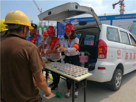 近日,广州天气连续气温高达40度,中铁四局建筑公司承建的广州官湖车辆段项目正处于生产大干时期,现场务工人员近1000人,为了做好现场防暑降温工作,战胜高温酷暑,如现场遇突发事件能够第一时间得到控制和处理