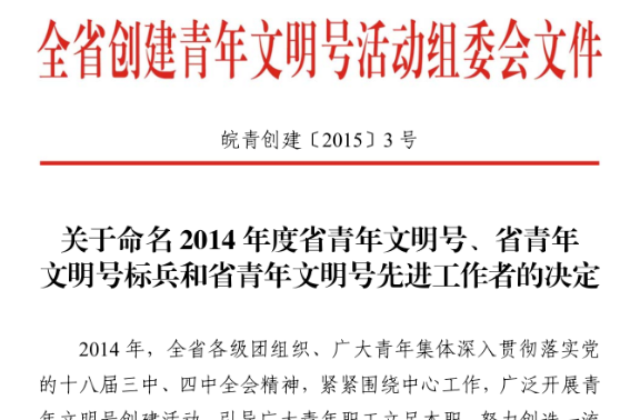 近日,建筑公司接到喜报——公司所属的昆明五腊村项目部在百余家参与的省“青年文明号”评选活动中顺利入选,获得2014年度安徽省“青年文明号”荣誉称号。